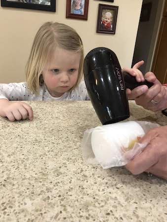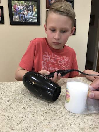 Elliot makes his candle. He holds the blow dryer much closer (than what Simeon did the first time) which is perfect.)