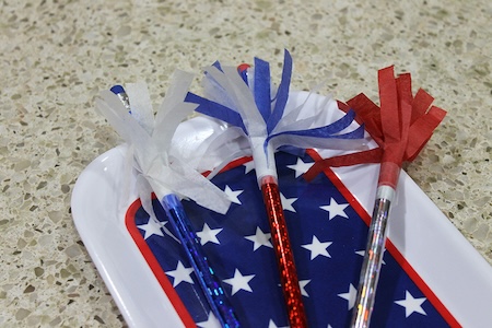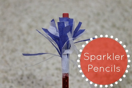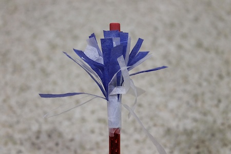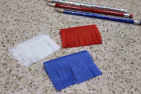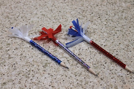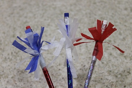 I combined blue tissue paper with white and taped it to a red pencil. I liked having 2 colors on the pencil so that the pencil’s color theme was red, white, and blue. If I had thought about it soon enough, I would have done it with the other pencils, too. Sigh.